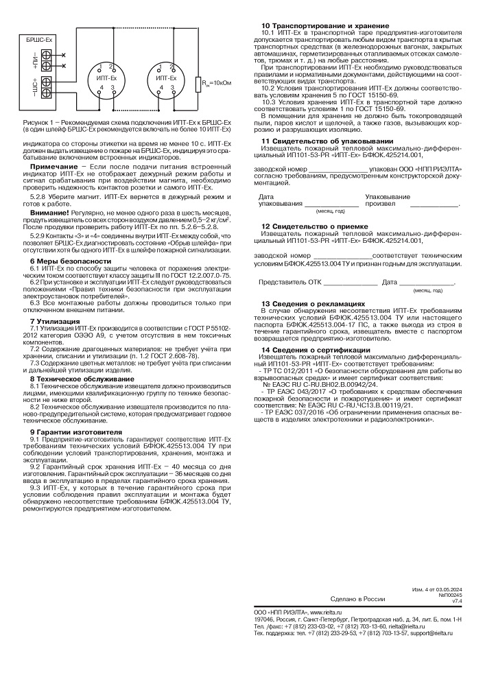 ИПТ-Ех (ИП 101-53-PR) извещатель тепловой максимально-дифференциальный Риэлта; 0Ex ia IIC T6 Ga X; от -40°С до +75°С; IP20; 125х70 мм.
