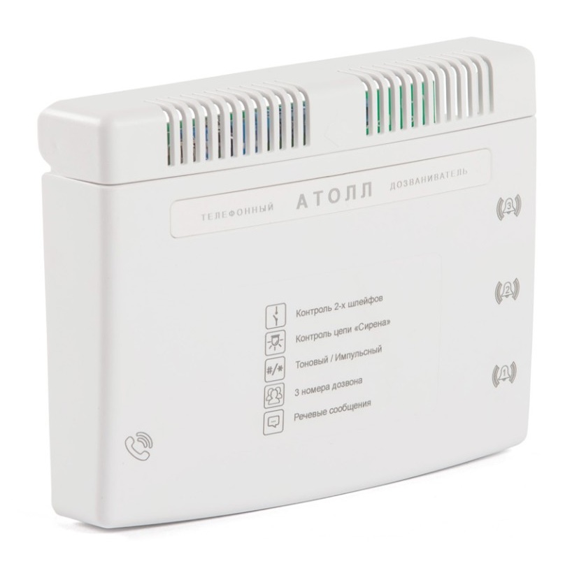 АТОЛЛ-Т-DIN телефонный дозваниватель по телефонной линии; 2 независимых сигнальных входа, вход типа «Сирена»; энергонезависимая память; дозвон по 3 номерам; набор номера в импульсном или тоновом режиме; IP20; 0…+40 С; 150х41х120 мм; 0,1 кг.