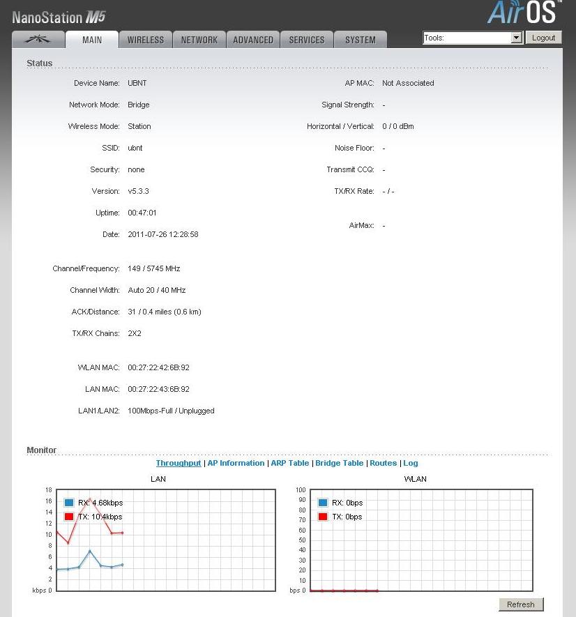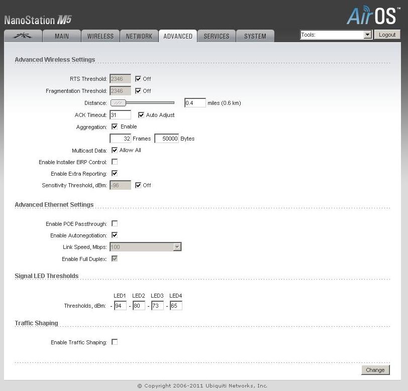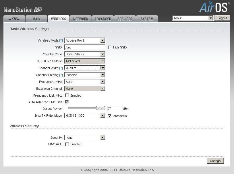 Еще одна важная особенность Ubiquiti NanoStation M5 — возможность настройки ширины канала в пределах от 10 до 40 МГц. Благодаря такому решению, можно устанавливать необходимые вам параметры линка, обеспечивая его максимальную дальность, сделав канал узким, но мощным, или же наоборот, обеспечить наибольшую пропускную способность моста. Следует отметить, что в большинстве случаев, оптимальным значением этого параметра будет 20 МГц.