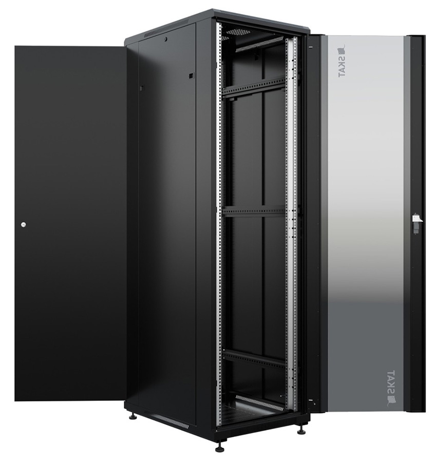 Напольный универсальный серверный шкаф предназначен для установки различного сетевого оборудования стандарта 19 дюймов (по ширине 485 мм), крепление которого соответствует требованиям ГОСТ 28601.2–90 (МЭК 60297). Пассивное и активное сетевое оборудование крепится на вертикальные 19" направляющие шкафа друг над другом. Доступ к оборудованию осуществляется со стороны передней и задней двери, а также съемных боковых стенок шкафа.