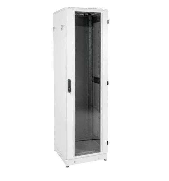 Двери. Три вида: цельнометаллическая, с тонированным ударопрочным стеклом или перфорированная. Возможна комплектация двумя дверьми (вместо задней стенки). Двери имеют правостороннюю и левостороннюю навеску, угол открытия 180°. Поставляются с предустановленной фурнитурой: замком (точечным в моделях 18-36U, ригельным в 42-48U), фиксаторами, демпферами. Конструкция двери со стеклом обеспечивает единый заземляющий контур и отсутствие зазора.