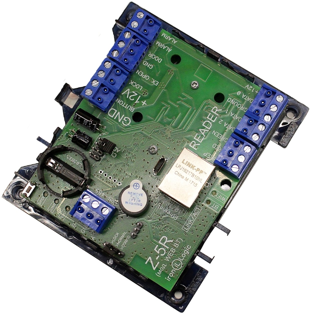 Z-5R (мод. Web BT) контроллер; 1 точка прохода; 2 входа считывателей с интерфейсом Dallas TM (IButton) или Wiegand 26/34/42/50; 2 банка памяти по 8168 ключей; 8192 событий; световая и звуковая индикация;интерфейс связи: Ethernet, Wi-Fi; питание: DC 8-28В; 200мА; +5...+50°C; 116х104х37 мм.