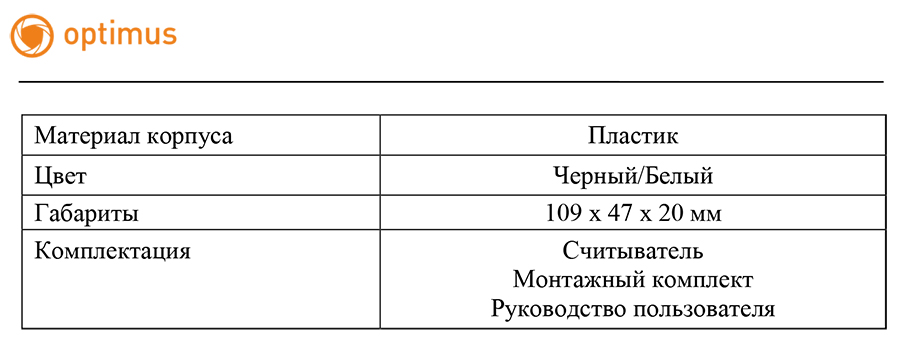 Комплектация: Считыватель, монтажный комплект, руководство пользователя