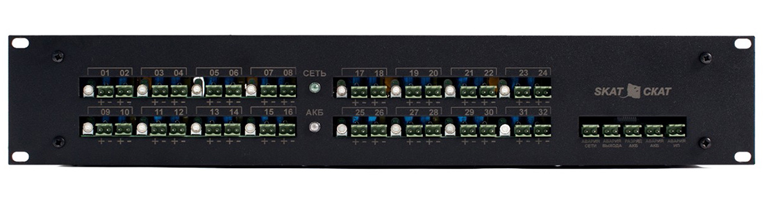 SKAT-V.32 RACK источник бесперебойного питания; 19" 2U; 32 выхода по 0,5 А или 16 выходов по 1 А; плавная регулировка выходного напряжения, максимальный ток по всем выходам — 14 А; 2 внешние АКБ 40 Ач; 5 информационных выходов о состоянии источника; 485х405х95 мм; 7,0 кг.