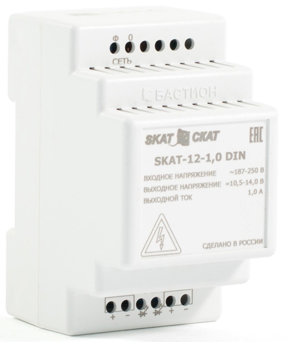 SKAT-12-1.0-DIN источник вторичного электропитания резервированный; входное напряжение 187...250 В; выходное напряжение 13,5...14 В; номинальный ток нагрузки 0,7 А; максимальный ток нагрузки 1 А (до 5 сек), под внешний аккумулятор 12 В 1,2 Ач; световая индикация режимов работы; защита от короткого замыкания; 53,5х89х65 мм; 0,11 кг.