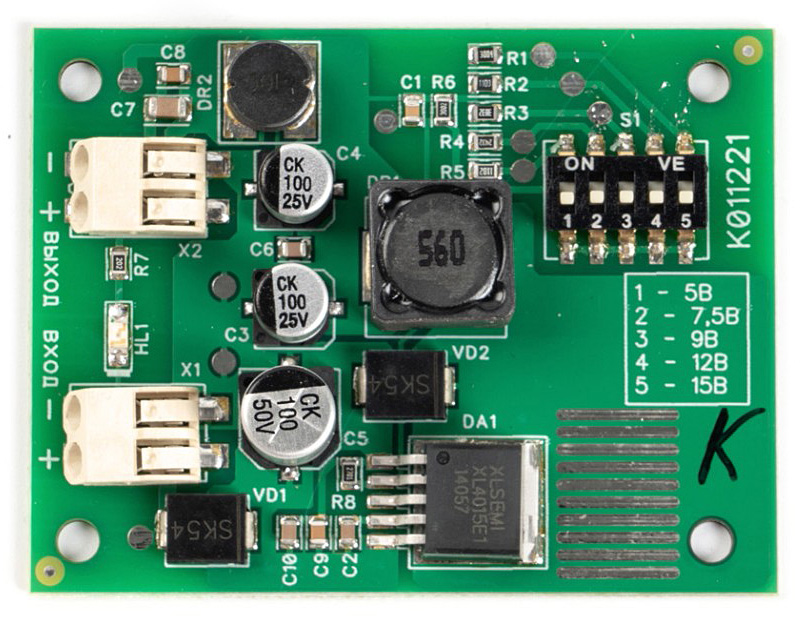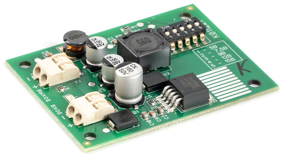 УПН-01 универсальный преобразователь напряжения входного напряжения от 7 до 30 В в фиксированное выходное напряжение 5 | 7,5 | 9 | 12 | 15 В; максимальный ток 1,5 А