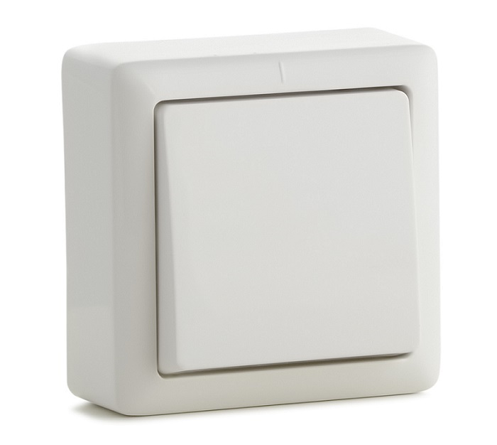 Выключатель открытой установки, одноклавишный, белого цвета. Номинальный ток - 6А. Габаритные размеры 63х63х32 мм. Масса - 44 г. Степень защиты - IP 20