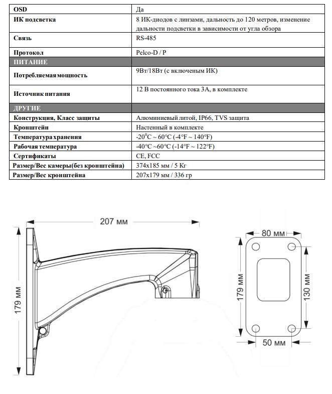 Размер/Вес кронштейна: 207х179 мм / 336 гр
