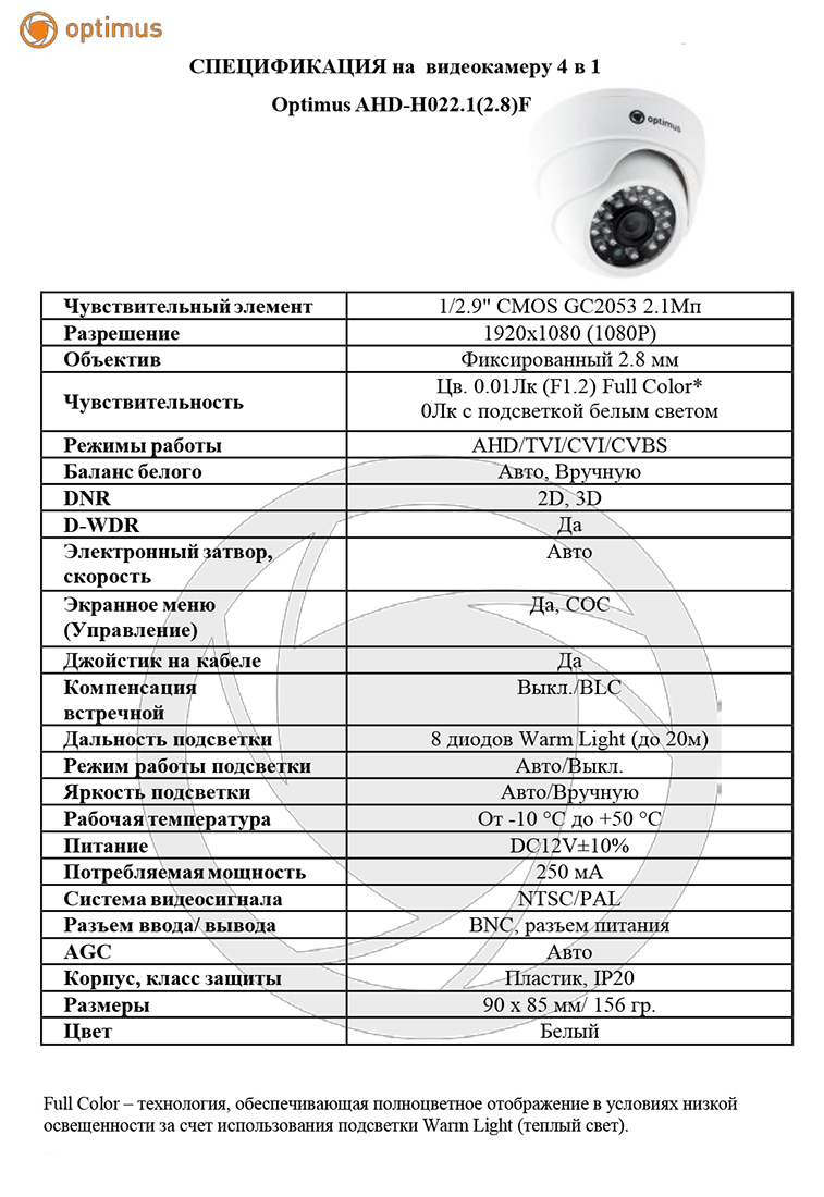 AHD-H022.1(2.8)F внутренняя камера видеонаблюдения Optimus; 1/2.9" CMOS GC2053 2.1Мп; 1920х1080 (1080P); AHD/TVI/CVI/CVBS; объектив фиксированный 2.8 мм; Ик-подсветка 20 м, 8 диодов; D-WDR; корпус пластик; IP20; цвет белый; от -10 °С до +50 °С; 90 х 85 мм; 156 г.