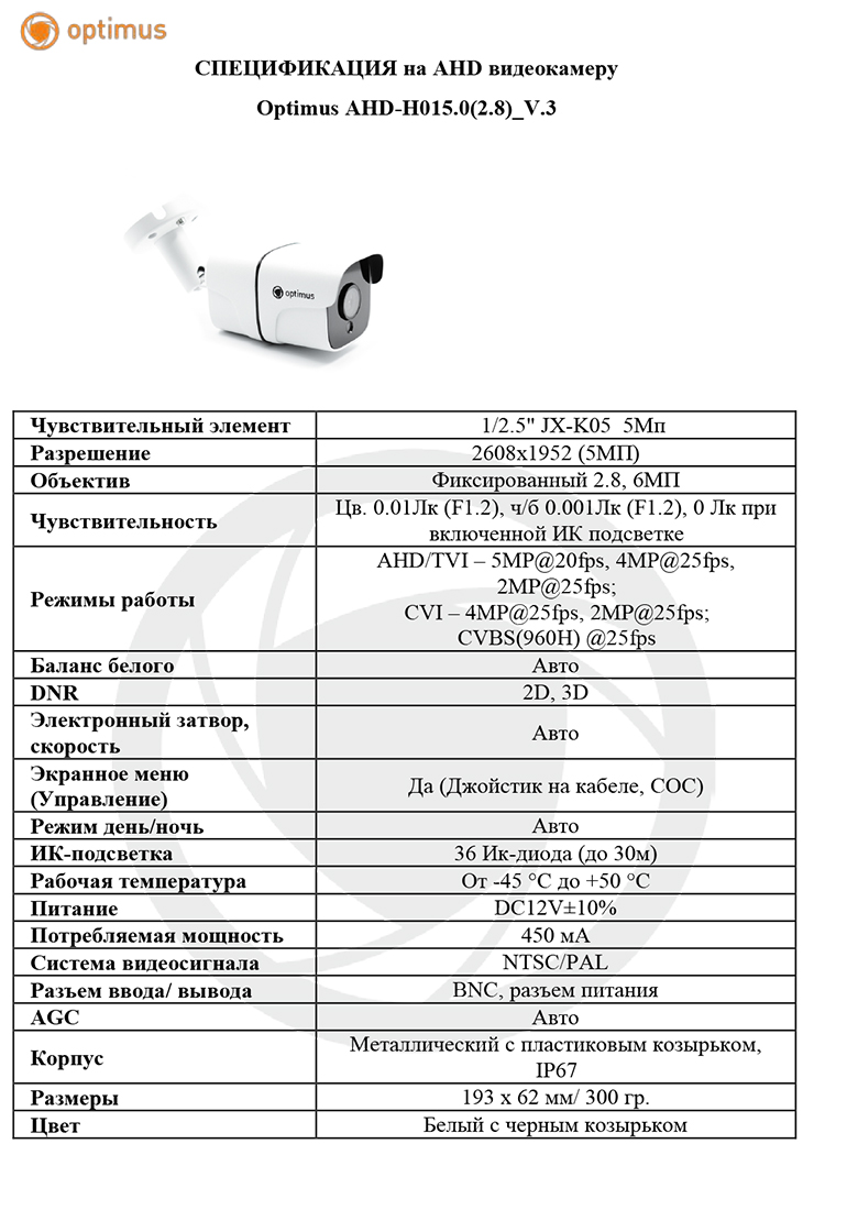 В основе камеры Optimus AHD-H015.0(2.8)_V.3 лежит чувствительный элемент производства JX-K05 диагональю 1/2.5" и разрешением 5 Мп. Камера позволяет получать качественное изображение высокого разрешения 2608х1952 пикселей. Модель оборудована фиксированным объективом 2.8 мм. Чувствительность камеры 0.01Лк (F1.2), ч/б 0.001Лк (F1.2), 0 Лк при включенной ИК подсветке.