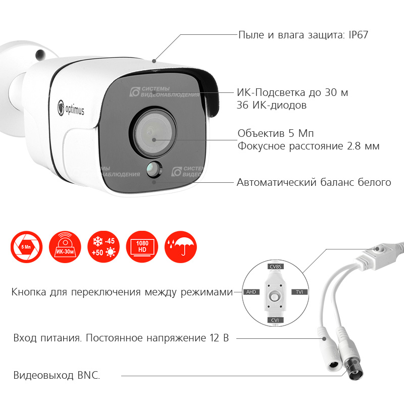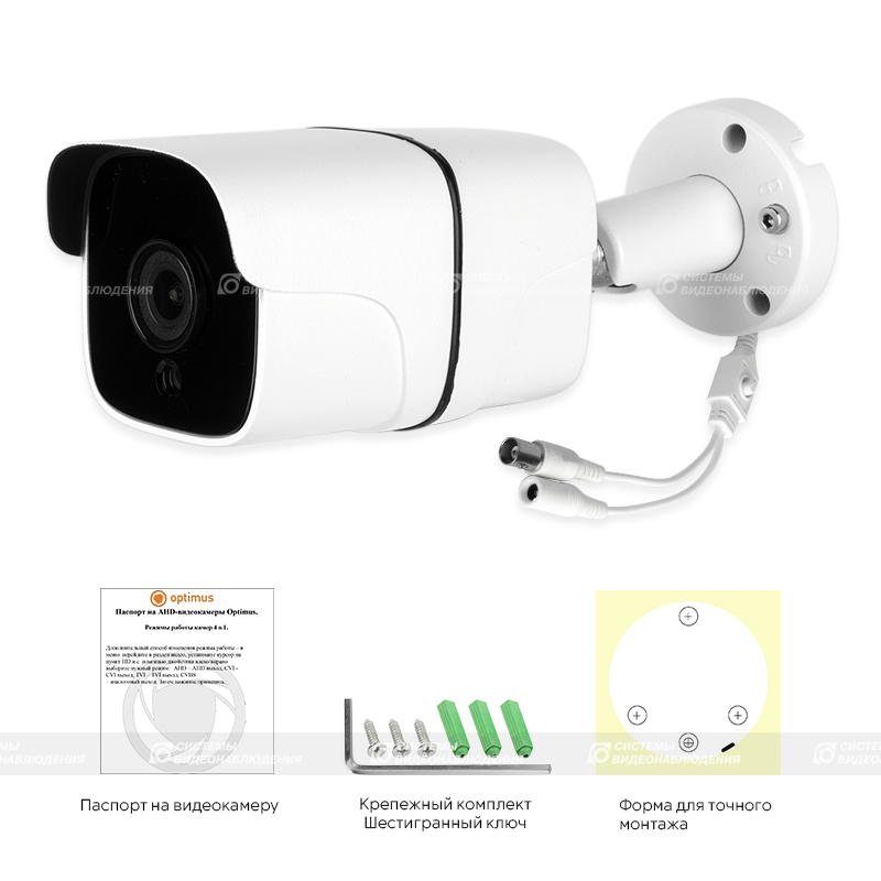 AHD-H015.0(2.8)_V.3 уличная камера видеонаблюдения Optimus; 1/2.5" JX-K05 5Мп; 2608x1952 (5МП);объектив фиксированный 2.8, 5МП; ИК-подсветка 30 м, 36 Ик-диода; корпус металлический с пластиковым козырьком; IP67; цв. белый; от -45°С до +50°С; 193 х 62 мм; 300 г.