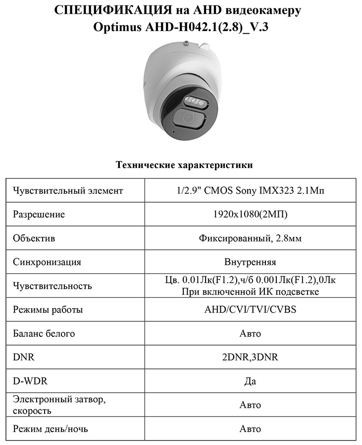 В основе камеры Optimus AHD-H042.1(2.8)_V.3 лежит чувствительный элемент CMOS диагональю 1/2.9" и разрешением 2.1 Мп. Камера позволяет получать качественное изображение высокого разрешения 1920х1080 пикселей. Модель оборудована фиксированным объективом 2.8 мм. Чувствительность камеры в цветном режиме составляет 0,01 Лк, в ч/б 0,001 Лк.