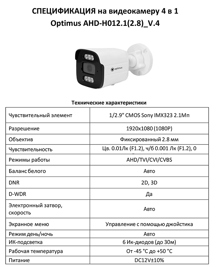 AHD-H012.1(2.8)_V.4 уличная камера видеонаблюдения Optimus; 1/2.9" CMOS Sony IMX323 2.1Мп; AHD/TVI/CVI/CVBS; объектив фиксированный 2.8 мм; ИК-подсветка 30 м; 6 ИК-диода; D-WDR; IP67; металл; -45°С...+50°С; 150х66х67 мм; 320 г.