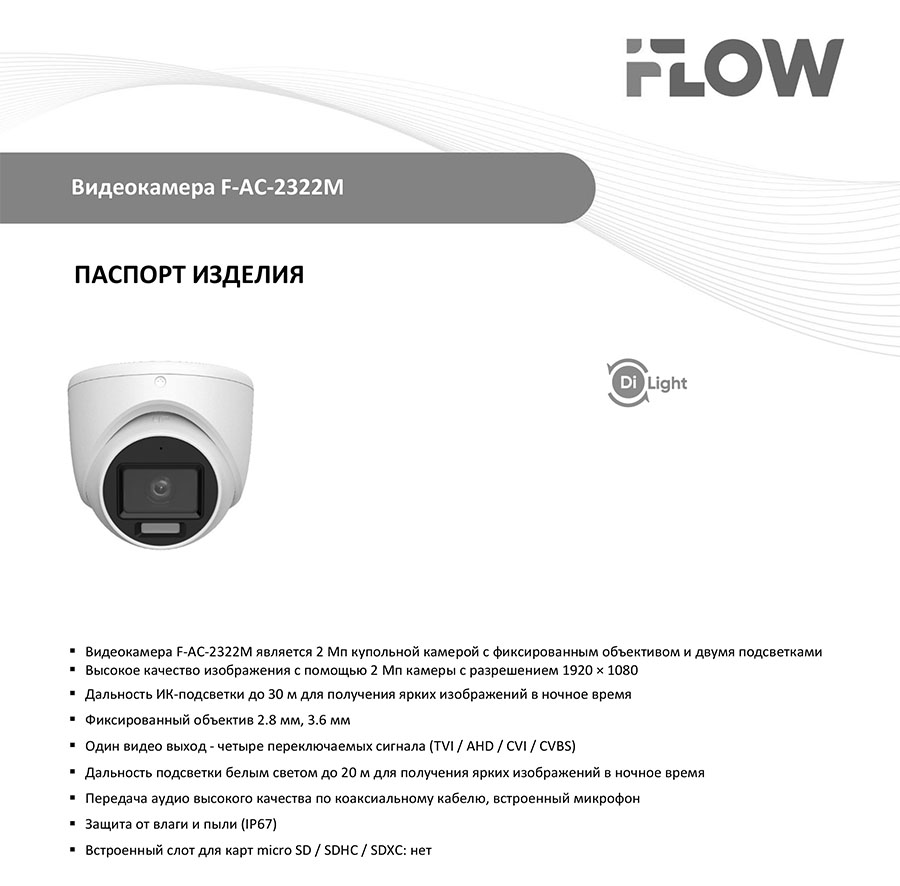 F-AC-2322M(2.8mm) 2Мп уличная купольная HD-TVI камера с гибридной подсветкой ИК/LED до 30/20м и встроенным микрофоном (AoC) iFlow; 2Мп CMOS матрица; объектив фиксированный 2,8; угол обзора 101°; механический ИК-фильтр; подсветка ИК/LED до 30/20м; OSD, DWDR, BLC, DNR; 1 х HD-TVI/AHD/CVI/CVBS; встроенный микрофон; IP67; белый; от -40 °C до +60 °C.
