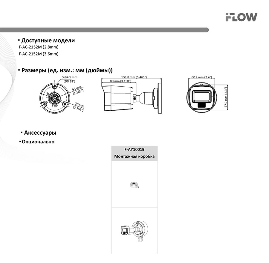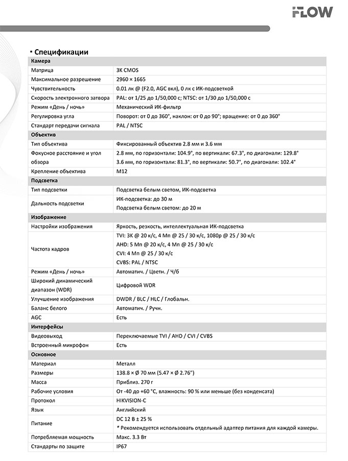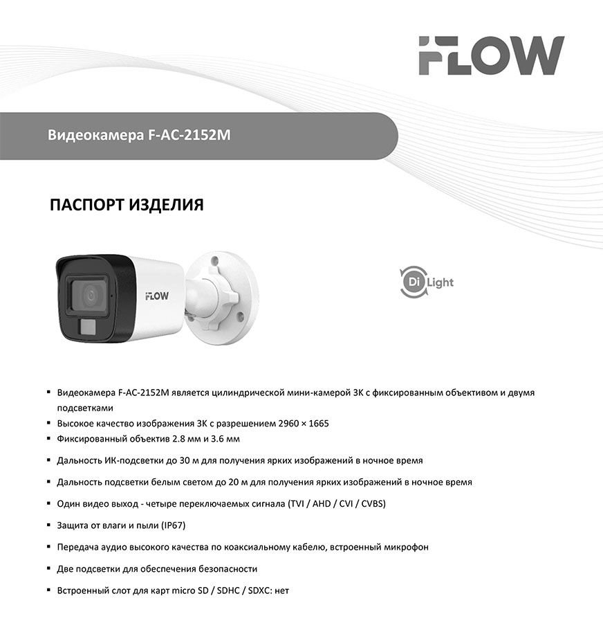 F-AC-2152M(2.8mm) 3К (5Мп 16:9) уличная цилиндрическая HD-TVI камера с гибридной подсветкой ИК/LED до 30/20м и встроенным микрофоном (AoC) iFlow; 3K CMOS матрица; 2960 × 1665@20к/с; объектив фиксированный 2,8; угол обзора 104,9°; механический ИК-фильтр; ИК-подсветка 30 м/LED 20 м; OSD, DWDR, BLC, DNR; 1 х HD-TVI/AHD/CVI/CVBS; встроенный микрофон; IP67; белый; от -40 °C до +60 °C.