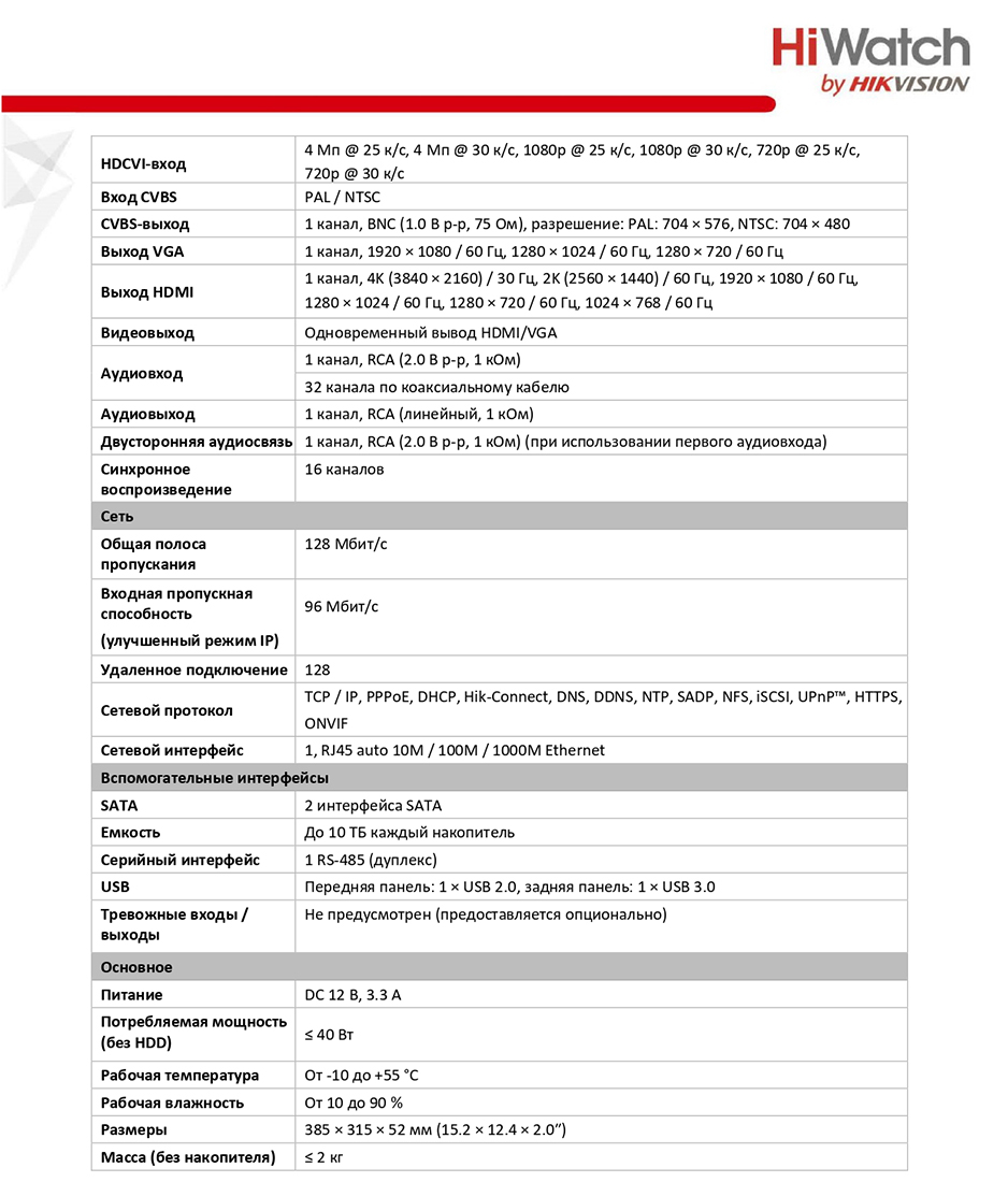 DS-H332/2Q(B) 32-х канальный гибридный HD-TVI регистратор HiWatch; 4 MP Lite/1080p @ 15 к/с; 720p/VGA/WD1/4CIF/CIF @ 25 к/с (P)/30 к/с (N); 1 канал, RCA; 1, RJ45 auto 10M/100M/1000M; 32 каналов BNC; USB 2.0; USB 3.0; 2 SATA до 10 ТБ; HDMI/VGA; DC 12 В, 3.3 A; -10...+55°C; 385×315×52 мм; 2 кг.