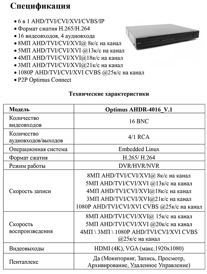 AHDR-4016_V.1 цифровой гибридный видеорегистратор 16-ти канальный Optimus; запись: 8MП AHD/TVI/CVI/XVI@ 8к/с на канал 5MП AHD/TVI/CVI/XVI @13к/с на канал 4MП AHD/TVI/CVI/XVI@18к/с на канал 3MП AHD/TVI/CVI/XVI@21к/с на канал 1080P AHD/TVI/CVI/XVI CVBS @25к/с на канал; H.265/H.264; 4/1 RCA; 2 HDD SATA до 14 ТБ; 3×USB; HDMI,VGA; 12 V DC/4А; 0°С...+55°С; 350х300х44 мм; 1,95 кг.