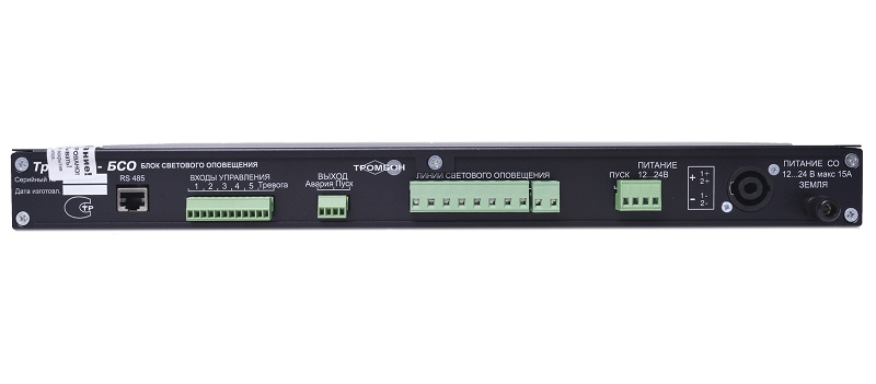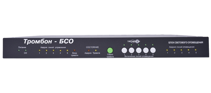 Тромбон БСО блок управления; управление и контроль линии связи со световыми оповещателями; выдача информации о неисправности подключений; DC 10-29В/<100мА; 5 контролируемых линий оповещения; дистанционное управление; 438х325х44 мм / 1U; 2 кг.
