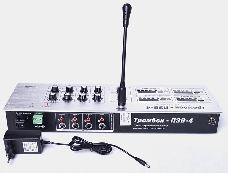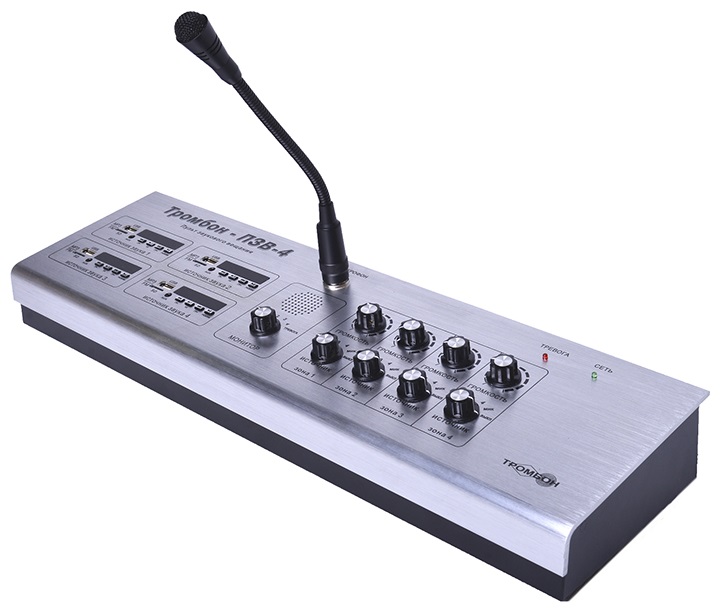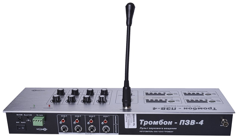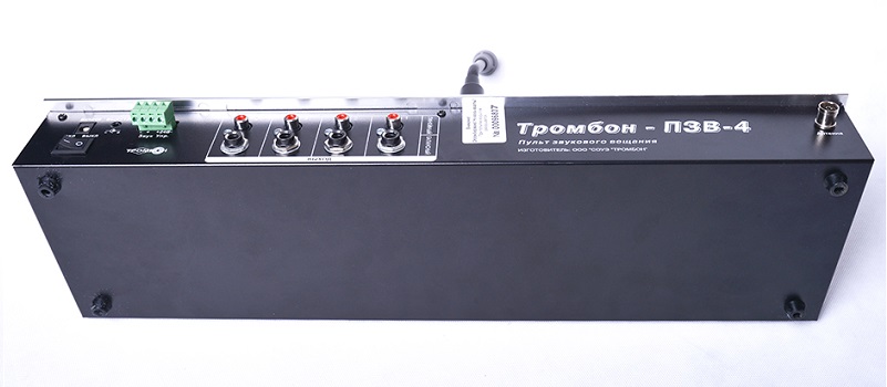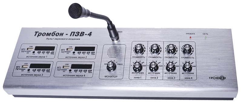 Тромбон ПЗВ-4 пульт звукового вещания четырехканальный; 4 радиоприёмника, 4 USB-входа для подключения флеш-накопителей, вход для 4 SD-карт, микрофон, 4 регулятора выходного уровня, 4 переключателя для выбора источников звука; питание 24В; 520х145х85 мм; 2,6 кг.