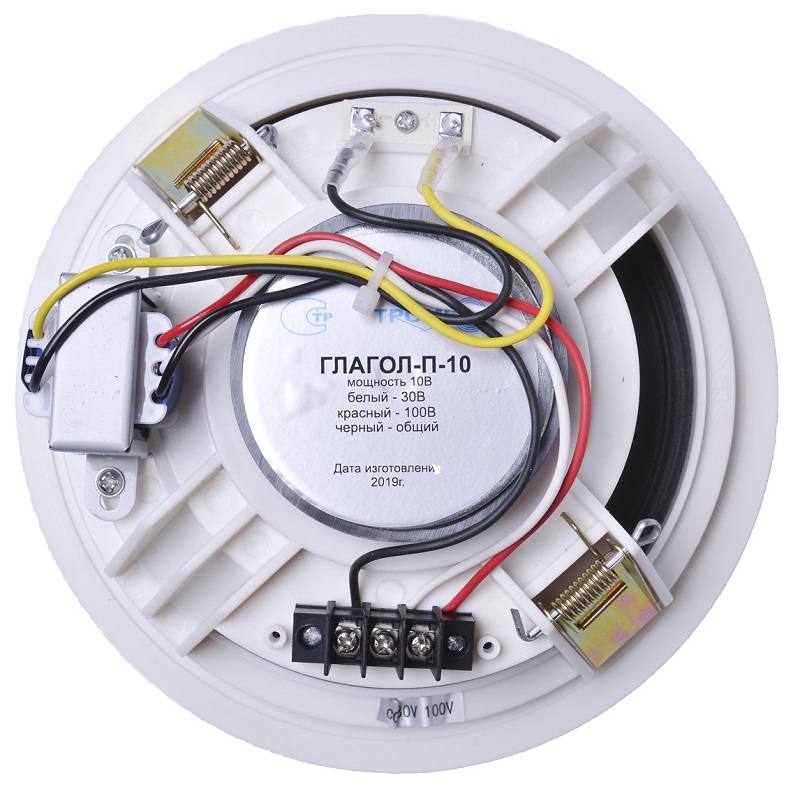 Глагол П-10 оповещатель речевой потолочный охранно-пожарный; встраиваемый; 10 Вт; напряжение 30/100В; 106 дБ; 100Гц-15кГц; (монтажное отверстие диаметр 172 мм); пластик; IP40; D186х80 мм; 0,7 кг.