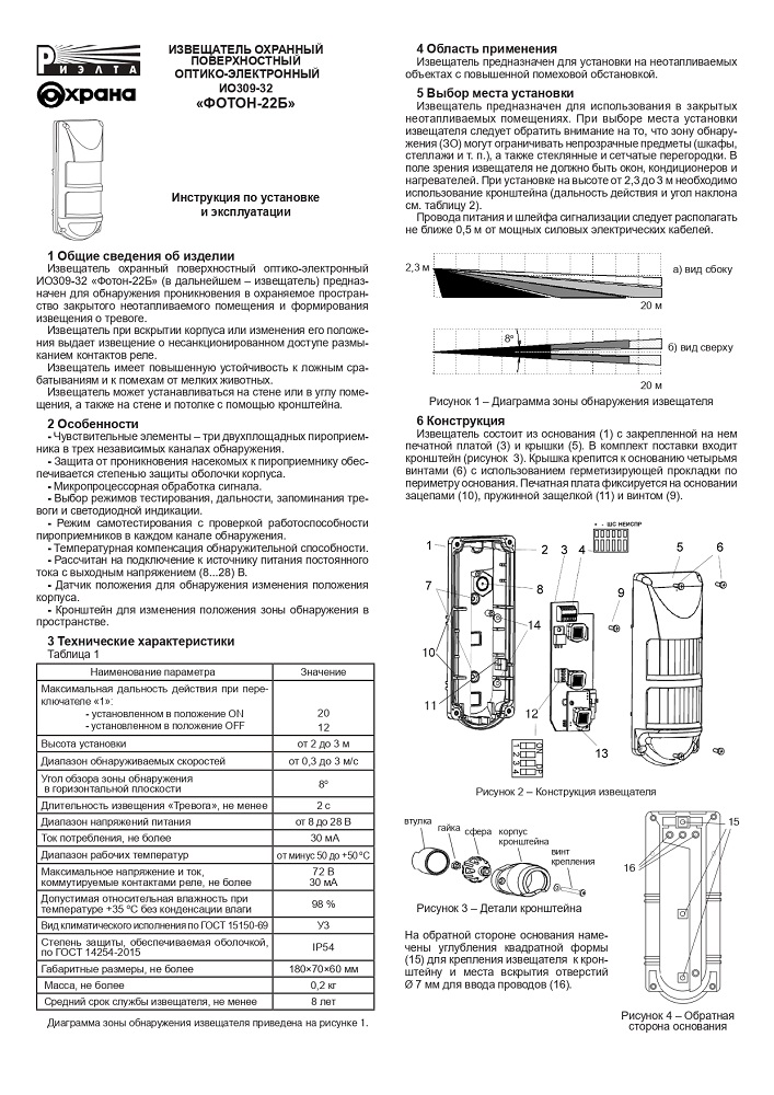 Извещатель охранный поверхностный оптико-электронный ИО309-32 «Фотон-22Б» - 1 шт.