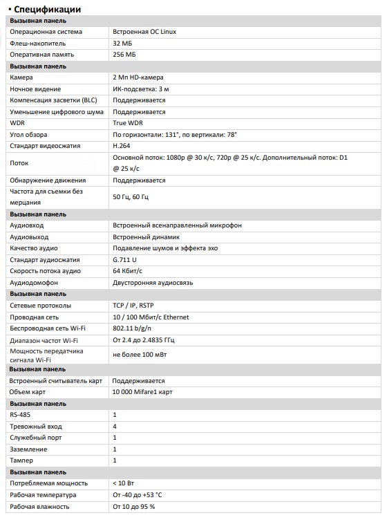 F-VI-5445I комплект IP видеодомофона с Wi-Fi iFlow; вызывная панель F-VI-1401IPMCWE1 × 1, видеодомофон F-VI-3242IPE1 × 1; Вызывная панель: встроенная ОС Linux; 32 МБ флеш-накопитель; 256 МБ оперативная память; 2 Мп HD-камера; ИК-подсветка 3 м; H.264; TCP / IP, RSTP; Wi-Fi 802.11 b/g/n; RS-485; IP65; -40...+53 °C; 138 × 65 × 27 мм; Видеодомофон: встроенная ОС Linux; память 128 МБ; флеш-накопитель 32 МБ; 7″ цветной TFT-экран; 1024 × 600; TCP / IP, SIP, RTSP; -10...+55 °C; 200×140×15.1 мм.