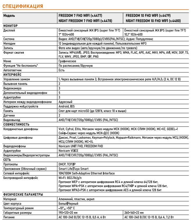 FREEDOM 10 FHD WIFI (ver.4479) видеодомофон Full HD NOVIcam; сенcорный HD IPS (super fine TFT) дисплей 10.1”; (1024х600); AHD/TVI/CVI(720p/1080p)/CVBS(PAL/NTSC); поддержка 5 доп.мониторов; видеокамер 3 и 2 датчиков; вызывных панель 2; интерком между мониторами адресный; MicroSD (до 128Гб, класс 10 и выше); цв. белый; материал пластик, акрил, алюминий; -10°~ +50° С; 260х160х23 мм.