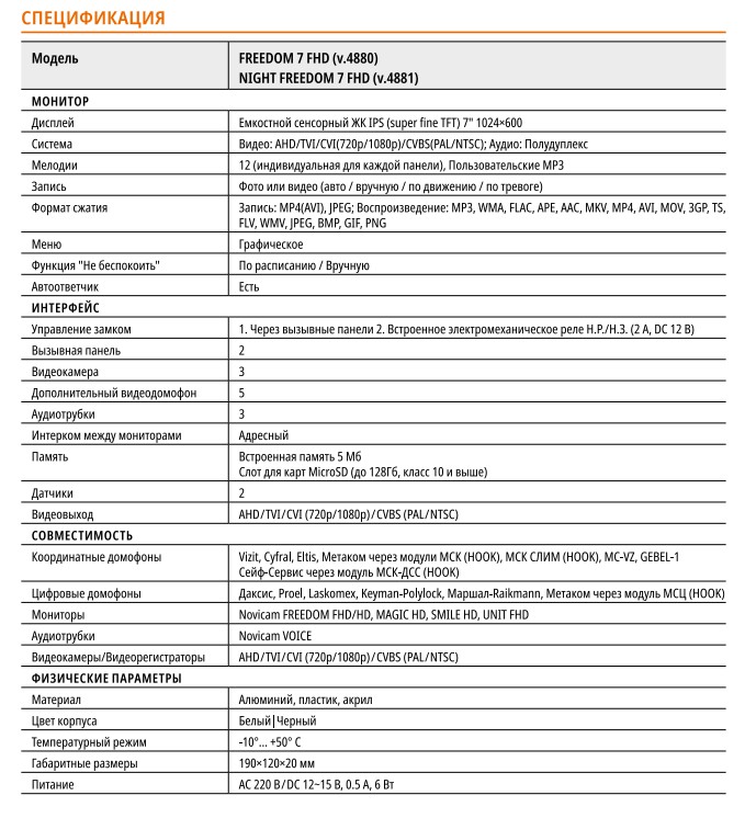 FREEDOM 7 FHD (ver.4880) видеодомофон Full HD Novicam; ёмкостной ЖК IPS (super fine TFT); диагональ дисплея: 7”; (1024х600); AHD/TVI/CVI(720p/1080p)/CVBS(PAL/NTSC); сенсорный дисплей; вызывная панель: 2; поддержка видеокамер: 3; поддержка доп.мониторов: 5; аудиотрубки: 3; MicroSD (до 128Гб, класс 10 и выше); встроенное электромеханическое реле Н.Р./Н.З.; выход для подключения к видеорегистратору; материал: пластик; цвет корпуса: белый; -10°~ +50°С; 190х120х20 мм.
