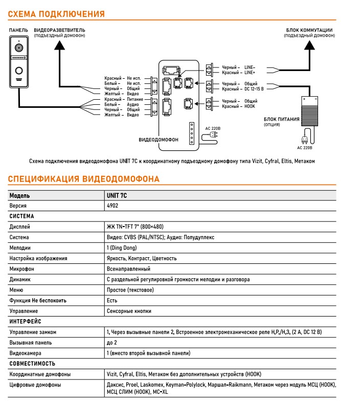 UNIT 7С (ver.4902) видедомофон Novicam; TN-TFT дисплей 7"; 800x480; сенсорные кнопки; поддержка видеокамер 1; поддержка: 2 вызывных панелей; реле Н.Р./Н.З.; HOOK; функция "Не беспокоить"; AC 100-240В; материал пластик; цвет корпуса белый; 10°...+50°С; 175х150х19 мм.