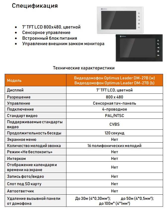 Leader DM-27B (b) видеодомофон Optimus; 7” TFT LCD, цветной; пластик, акрил; АС 100-240 В; 800х480; CVBS; 16 полифонических мелодий; IP 54; От 0° до + 50°С; 200x122x21 мм; 445 г.