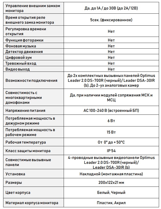 Расшифровка*: Данная модель видеодомофона совместима со следующими моделями вызывных панелей Optimus: • Optimus Leader DSA-30IR (b) • Optimus Leader 2.0 DS-700R (черный)