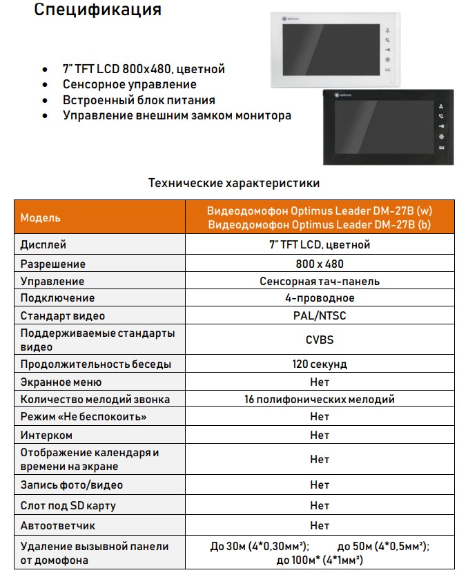 Расшифровка*: Данная модель видеодомофона совместима со следующими моделями вызывных панелей Optimus: • Optimus Leader DSA-30IR (b) • Optimus Leader 2.0 DS-700R (черный)