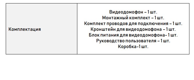 Комплектация: Видеодомофон – 1 шт., Монтажный комплект – 1 шт., Комплект проводов для подключения – 1 шт., Кронштейн для видеодомофона – 1 шт., Блок питания для видеодомофона- 1 шт., Руководство пользователя – 1 шт. Коробка-1 шт.