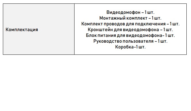 Комплектация: Видеодомофон – 1 шт., Монтажный комплект – 1 шт., Комплект проводов для подключения – 1 шт., Кронштейн для видеодомофона – 1 шт., Блок питания для видеодомофона- 1 шт., Руководство пользователя – 1 шт. Коробка-1 шт.