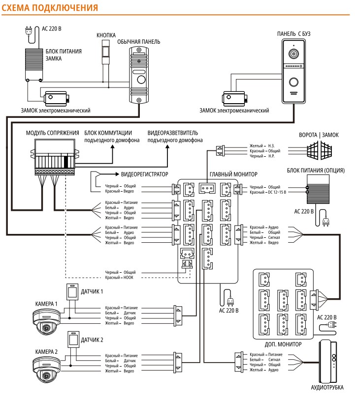 Подключение 2 вызывных панелей, 5 доп.мониторов, 2 видеокамер и 2 датчиков