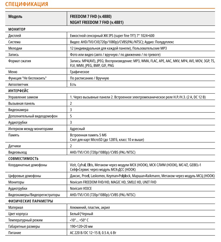 FREEDOM 7 FHD NIGHT (ver.4881) видеодомофон с сенсорным дисплеем 7" и записью Novicam; сенcорный HD IPS (super fine TFT) дисплей 7”; питание от сети AC 100-240В; 1024х600; -10°~ +50° С; 190х120х20 мм; 1,320 кг.