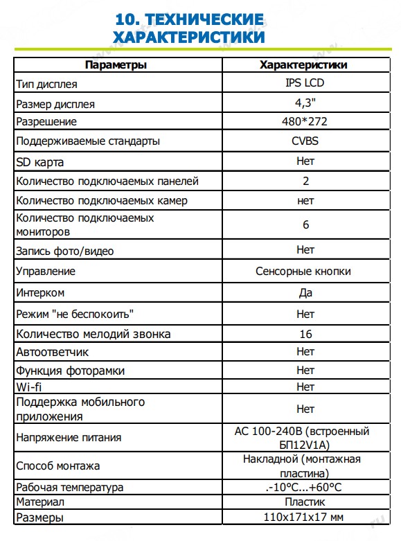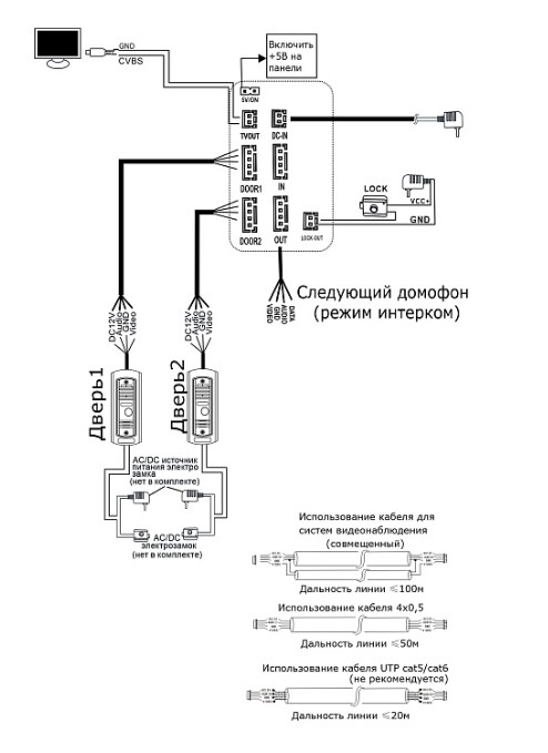 Возможности подключения: До 2х вызывных панелей, до 6ти мониторов
