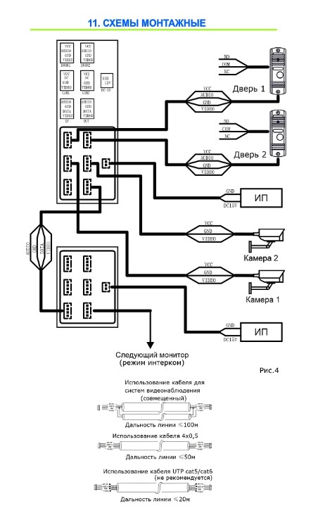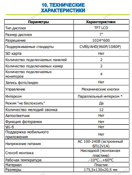 Возможности подключения: До 2х вызывных панелей, до 2х камер, до 4х мониторов*