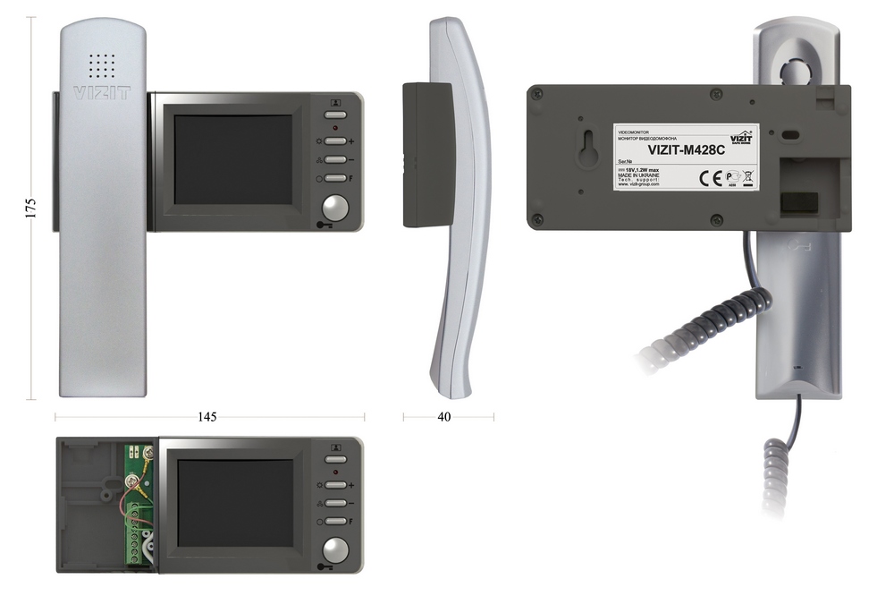 VIZIT-M428C монитор многоабонентского видеодомофона цветной, аналог VIZIT-M427C; TFT LCD 2,7"; PAL; подключение кнопки "Звонок"; кнопки управления освещением; регулировка яркости, насыщенности, громкости; питание 15...27 В, совместная работа с БКМ-440(М), БКМ-441, БКМ-444; серый металлик; +5…+40 °С; 145х175х40.
