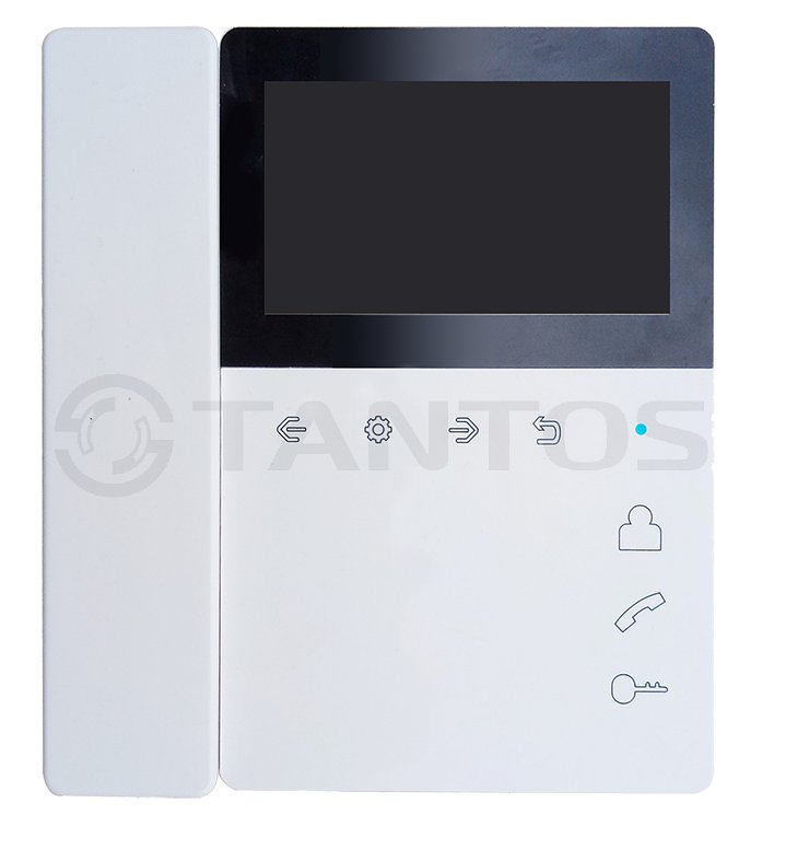 Elly монитор видеодомофона с трубкой Tantos; TFT LCD 4,3" 480x272; PAL/NTSC; сенсорные кнопки; 2 панели; трубка/ Hands-Free; до 4-х шт. в параллель; возможность открывания замка калитки и ворот при использовании одной вызывной панели при подключении реле TS-NC05; индивидуальный/многоквартирный режим; режим прослушивания других мониторов; белый; 0...+40°С; 160х180х32 мм; 368 г.