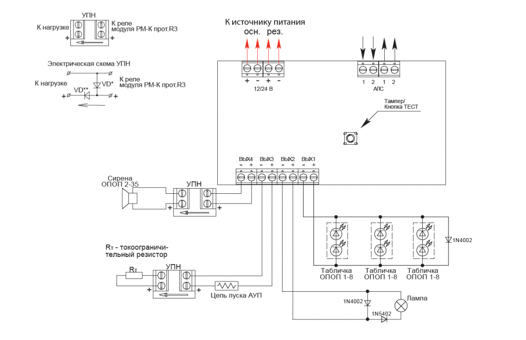 Для обеспечения контроля линии на короткое замыкание и обрыв УПН должен быть подключен непосредственно к нагрузке релейного выхода (к исполнительному устройству) согласно схеме подключения к Вых4, изображенной на рисунке. Если необходимо контролировать целостность цепи нагрузки, то подключение производится по схеме, подключенной к Вых3 на схеме. Вместо УПН для контроля цепи можно использовать диоды - их установка показана на схеме подключения к Вых2. Также возможно подключение на один выход до 8 табличек ОПОП 1-8 или ОПОП 1-8М. В этом случае таблички подключаются параллельно на линию и в конце линии устанавливается один диод, обеспечивающий протекание контрольного тока. Схема установки показана на схеме при подключении к Вых1.