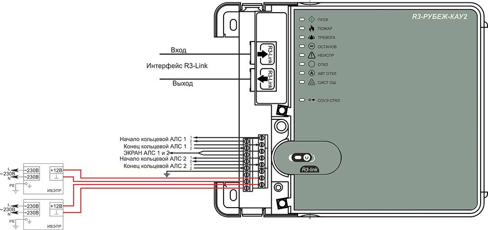 R3-Рубеж-КАУ2 контролирует адресные устройства по 2-м адресным линиям связи (АЛС) и позволяет работать с радиальными, кольцевыми, древовидными АЛС. Общая длина каждой АЛС – не более 3000 м. Имеется контроль АЛС на КЗ, обрыв, перегрузку, контроль исправности устройств в АЛС.