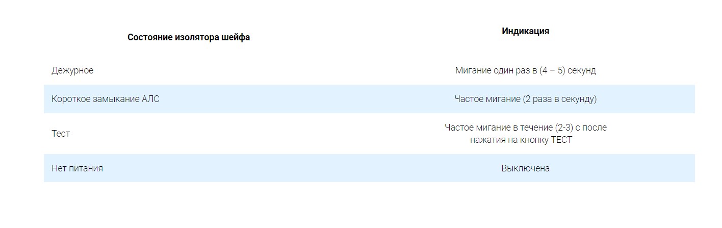 При замыкании линии, подключенной к клеммнику – АЛС1 или АЛС2, светодиодный индикатор начинает частое промаргивание с частотой 2 Гц. При устранении замыкания линии работоспособность системы восстанавливается и светодиод переходит в дежурное промаргивание - 1 раз в 4-5 сек.