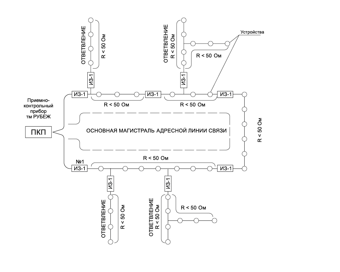 Защищаемый участок шлейфа начинается у изоля- тора и заканчивается у следующего изолятора или у последнего устройства в шлейфе или ответвлении.