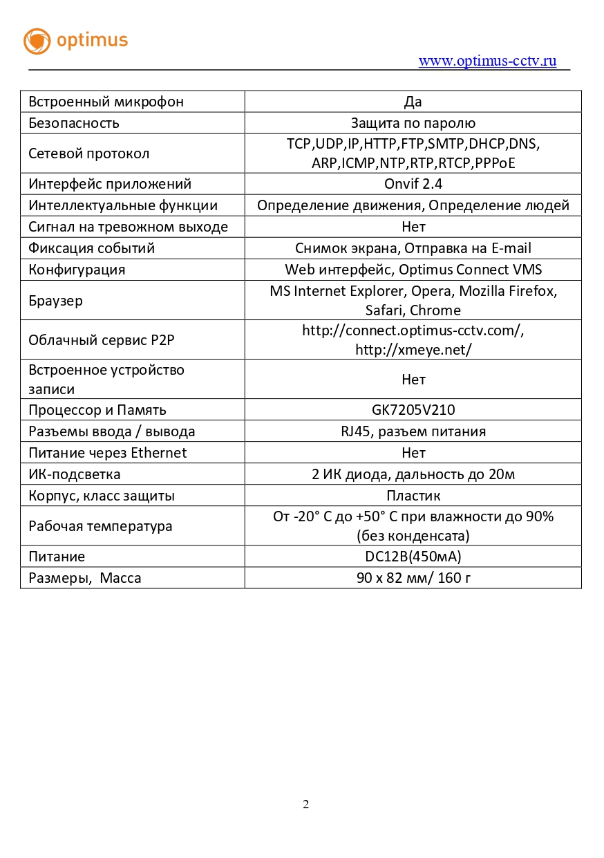 Камера выполнена в пластиковом корпусе степенью защиты IP20. Рабочая температура от -20° С до +50° С