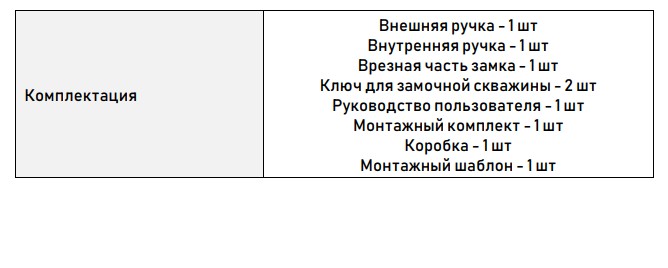 Комплектация: Внешняя ручка - 1 шт, Внутренняя ручка - 1 шт, Врезная часть замка - 1 шт, Ключ для замочной скважины - 2 шт, Руководство пользователя - 1 шт, Монтажный комплект - 1 шт, Коробка - 1 шт, Монтажный шаблон - 1 шт