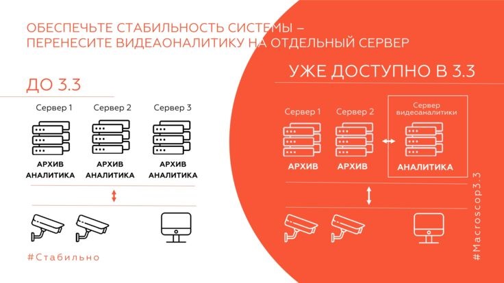 Используете интеллектуальные модули? Теперь можно повысить надежность системы видеонаблюдения за счет гибкой настройки серверов и распределения функциональности между ними. Выделите отдельные серверы для обработки данных видеоаналитики. Это позволит избежать дополнительной и, подчас, неравномерной нагрузки на основные серверы, которые в такой конфигурации будут выполнять базовые задачи видеонаблюдения: получение, запись и воспроизведение видео с камер.