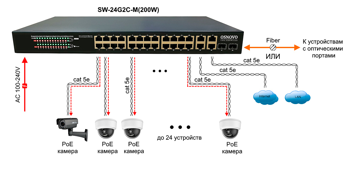 SW-24G2C-M(200W) может быть интегрирован в более крупную сеть. Его преимущество — поддержка 90 Вт PoE++ на первых четырех портах, что позволяет использовать современные камеры без инжекторов питания.