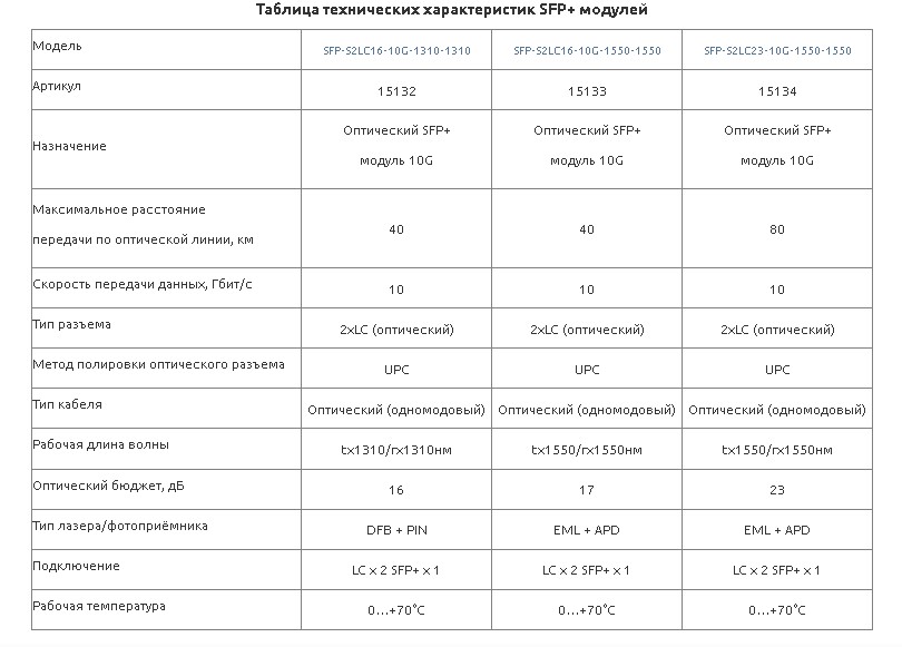 В модели SFP-S2LC16-10G-1310-1310 используется DFB лазер в связке с PIN фотодиодом, это надёжная двустороння связь и точная стабилизация передачи сигнала за разумную цену. Модели SFP-S2LC16-10G-1550-1550 и SFP-S2LC23-10G-1550-1550 работают на EML лазере и APD фотодиоде — это чистый непрерывный сигнал и высокая скорость передачи, такая связка безотказно работает на длинных расстояниях без промежуточного усилителя.