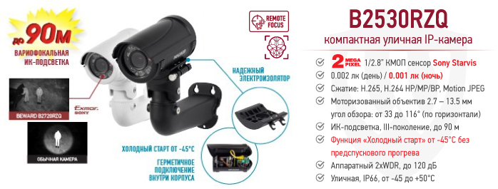 IP-камера B2530RZQ – это идеальное решение для сурового российского климата за счет применения качественных компонентов и отлаженной конструкции, прошедшей испытание временем. Независимо от погодных условий и перебоев в электропитании функция «холодный старт» обеспечивает включение камеры в работу в штатном режиме без предпускового прогрева.